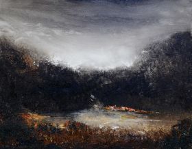 In The Antique Style by Maurice Sapiro is a landscape of a dark pond in a hollow, with a glimpse of the open landscape nearby through a ravine. This piece captures the smooth water, the jagged foilage and the soft sky in various neutral tones with deep brown shadows and a blush of pink.